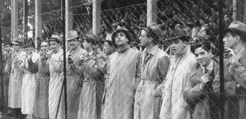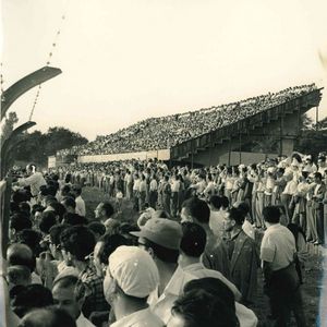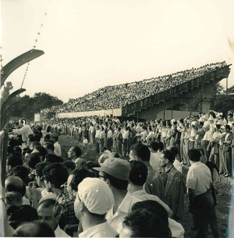 La foto documenta i problemi strutturali legati all’assenza di tribune adeguate nello stadio comunale pratese: secondo le cronache, dei 10 mila spettatori dell’amichevole solo il 20% trovò posto nelle tribune; il resto, dovette accontentarsi di assistere in piedi contro le reti di cinta o in equilibrio su laterizi di fortuna (ASPo, Bisori Guido, Pratiche 1953-58, fasc. 220, 20 B9 5b).