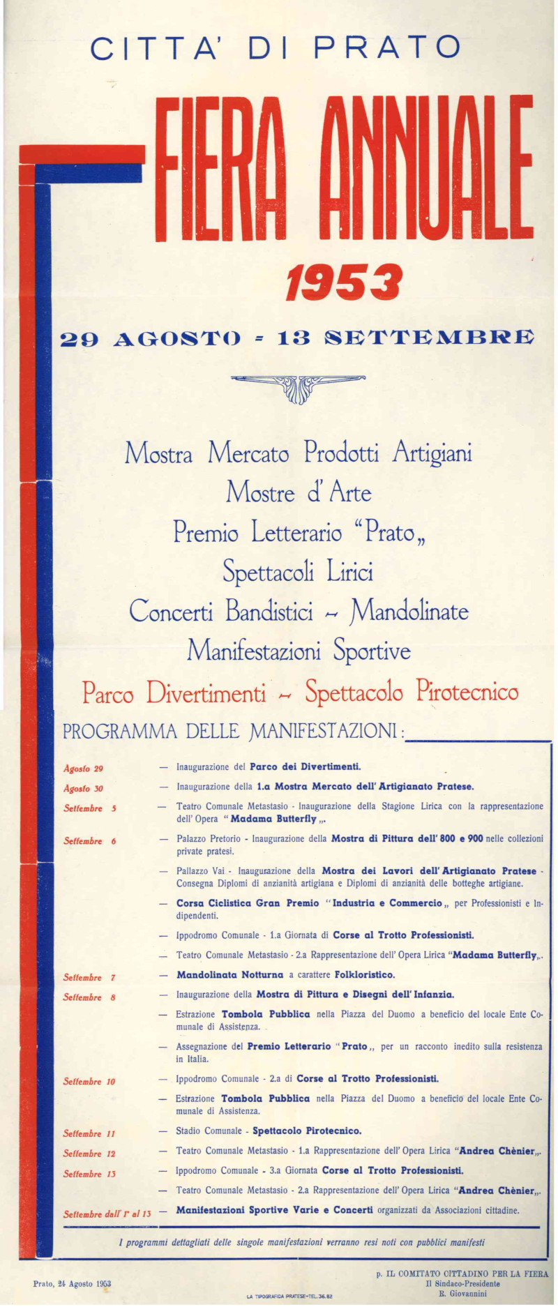 Ad esempio, grazie all’iniziativa di Giovannini e del Comitato organizzatore da lui presieduto, l’evento fieristico settembrino pratese recuperò nel 1953, dopo alcuni anni di crisi, ampiezza di respiro: ciò interessò sia la parte espositiva e commerciale, rappresentata dalla Mostra-mercato dell’artigianato locale allestita in prossimità dei giardini di piazza Mercatale; sia la parte artistica, con una mostra pittorica allestita nei rinnovati locali della Galleria comunale, quattro recite liriche presso il Metastasio e l’assegnazione del premio letterario; sia, infine, l’intrattenimento popolare, con eventi sportivi e ludici.