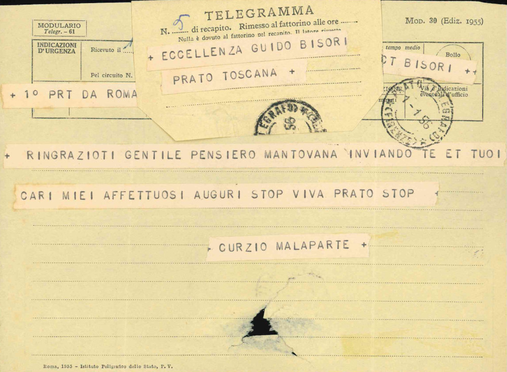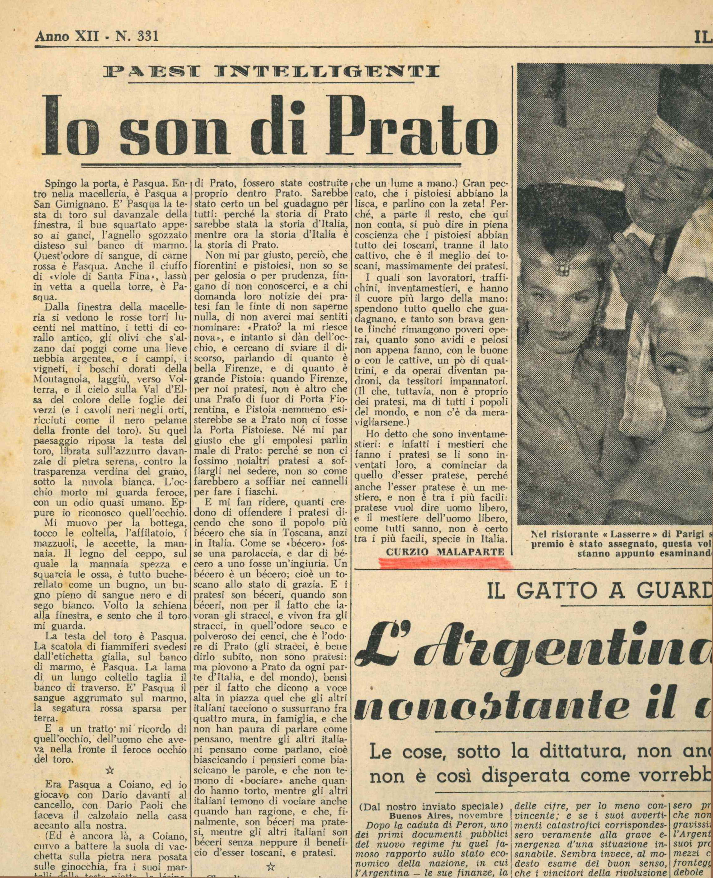 L’articolo è un celebre passo poi confluito nel libro "Maledetti Toscani" (pubblicato nel novembre 1956), in cui lo scrittore pratese (al secolo Kurt Erich Suckert, 1898-1957) esprime con orgoglio e ironia il suo pro-fondo legame con la città natale (ASPo, Bisori Guido, Nominativi 1953-1958, fasc. 1).